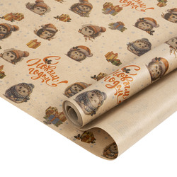 Упаковочная бумага, Крафт 40гр (0,68*10 м) Новогодние ежики, Коричневый, 1 шт.