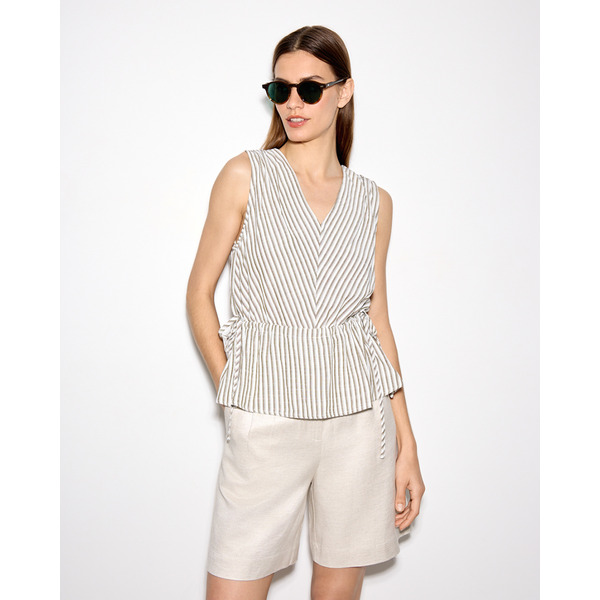 Легкий летний топ из тонкого дышащего хлопка с модалом. Плечи и спинка закрыты (удобно носить с любым бельем), но V-вырез деликатно приоткрывает ключицы и декольте, подчеркивает хрупкость и визуально “удлиняет” шею. Силуэт топа можно трансформировать по настроению с помощью кулиски на талии с завязками по бокам.