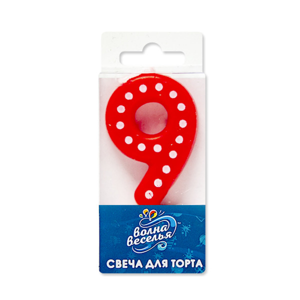 Свеча Цифра, 9 Белые точки, Красный, 3*4,5 + 1,5 см, 1 шт. с держат.