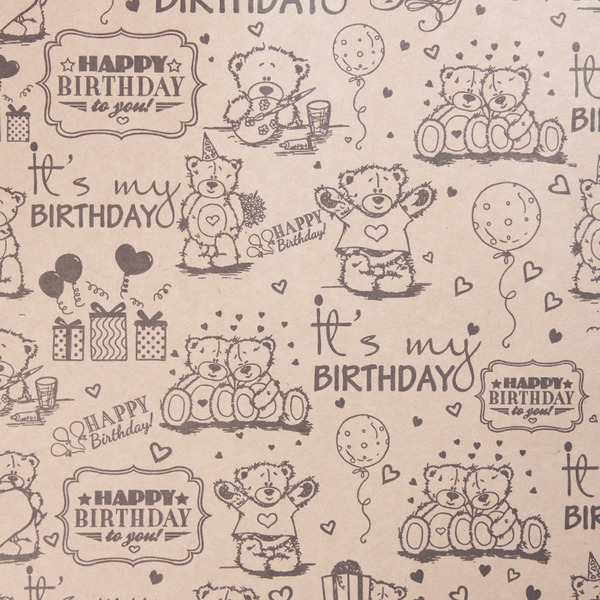Упаковочная бумага, Крафт 65гр (0,7*9 м) Мишки Тедди, Черный, 1 шт.