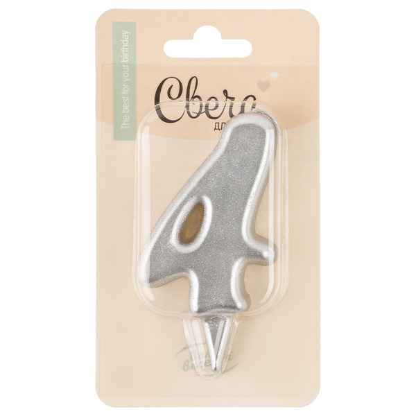 Свеча Цифра, 4 Овал, Серебро, Металлик, 7 см, 1 шт. с держат.