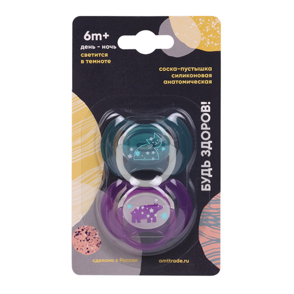 Соска-пустышка Будь здоров силикон нагубник бабочка светящ в темноте (с 6 мес), 2 шт