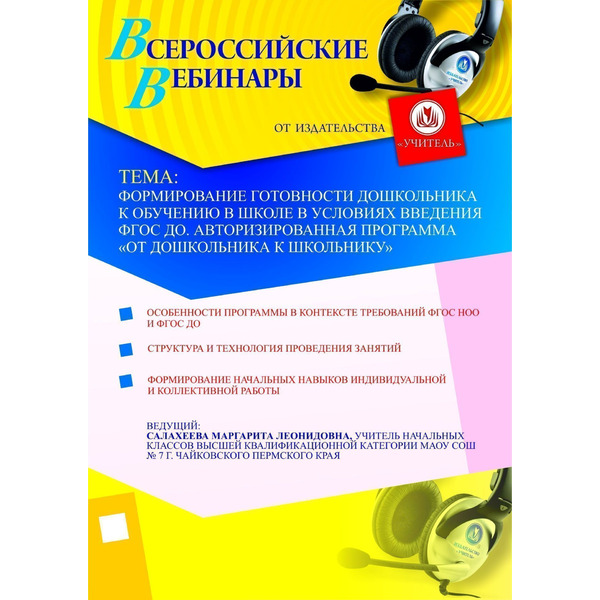 Приглашаем учителей начальных классов, воспитателей ДОО, педагогов дополнительного образования, специальных педагогов, заместителей директора по УВР, методистов и руководителей методических объединений принять участие в offline-вебинаре «Формирование готовности дошкольника к обучению в школе в условиях введения ФГОС ДО. Авторизированная программа “От дошкольника к школьнику”».