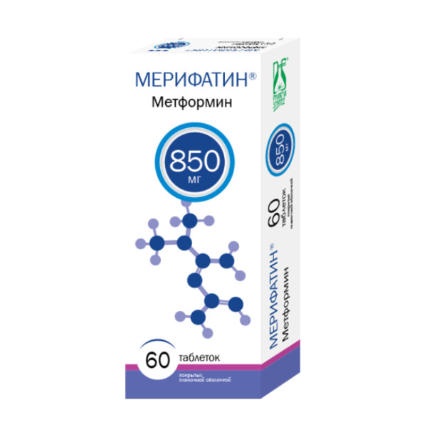 Метформин Мерифатин 850 мг, 60 шт, таблетки покрытые пленочной оболочкой