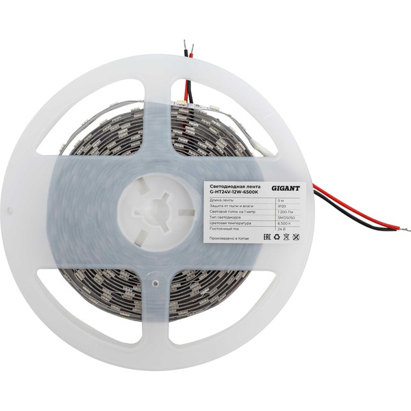 Светодиодная лента Gigant 5м, IP20, 1200Лм, SMD5050, 6500К G-HT24V-12W-6500K является прекрасным решением для организации основного освещения и ярких декоративных подсветок. Она подойдет для создания основного освещения на базе многоуровневых потолков, а также будет отличным выбором для освещения торгового оборудования или требующих большой яркости рекламных вывесок. По сравнению с лампами накаливания светодиодная лента эквивалентна лампам мощностью 80 Вт. Данная модель светодиодной ленты обладает холодным белым цветом свечения с цветовой температурой 6500 К. При выборе светодиодной ленты важно учитывать такой параметр, как потребляемая мощность, чтобы правильно подобрать блок питания. Степень защиты этого изделия соответствует стандарту IP20, что подразумевает использование только в сухих и проветриваемых помещениях. Отрезать светодиодную ленту можно в специально отмеченных местах, которые располагаются через каждые 100 мм. Компактные размеры светодиодной ленты с шириной 10 мм и основанием из гибкой, двухслойной, медной подложки дают огромное преимущество при создании любых дизайнерских фантазий. Яркое и равномерное свечение без мерцания. Срок службы светодиодов составляет до 40 000 часов. Удобный монтаж - задняя часть подложки имеет клейкую полосу 3М. Можно регулировать длину ленты, отрезая её в специальных местах, которые расположены через каждые 120 мм.