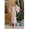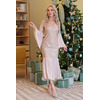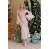 Вечернее платье полуприлегающего силуэта из текстильного полотна (кружево на текстильной основе) бежевого цвета с цветочным узором. Фигурный вырез обработан кантом. Втачные рукава и низ изделия дополнены вставками из струящегося полупрозрачного шифона.