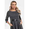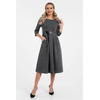 Очаровательное платье полуприлегающего силуэта из трикотажного полотна серого цвета. Круглый вырез изделия обработан внутренней обтачкой. Завышенная линия талии подчеркнута втачным поясом. По переду изделия выполнены складки. Платье с втачными рукавами, по боковым швам карманы. Длина изделия по спинке от плечевого шва до низа изделия — 111 см.