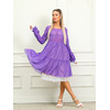 Эффектное платье свободного силуэта из шифона. Круглый вырез изделия обработан внутренней окантовкой. Втачные рукава обработаны резинкой. Платье с завышенной линией талии, юбка состоит из оборок. По низу изделия и рукавов кружево. Юбка на однотонном трикотажном подкладе. Длина изделия по спинке от плечевого шва до низа изделия — 100 см. Рост фотомодели — 170 см.
