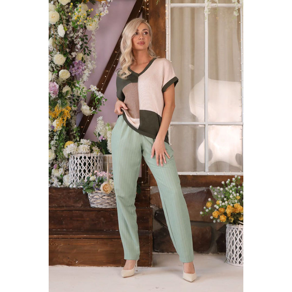Стильные брюки полуприлегающего силуэта из текстильной ткани мятного цвета. Верхняя часть изделия обработана поясом с декоративной резинкой. По переду изделия выполнены складки. Длина изделия от пояса до низа — 105 см.