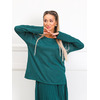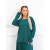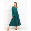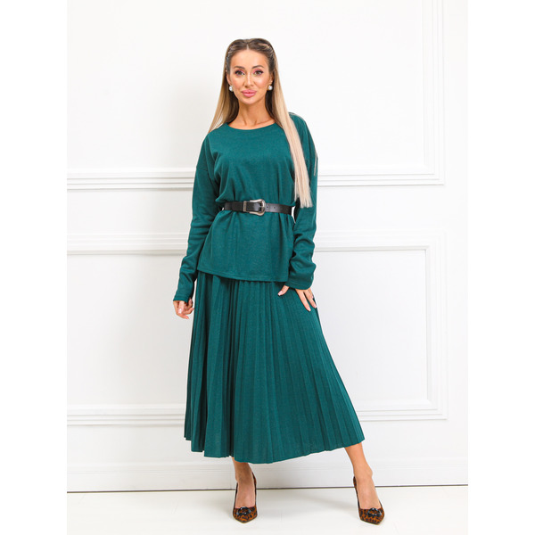 Очаровательный костюм полуприлегающего силуэта из трикотажного полотна зеленого цвета. Круглый вырез джемпера обработан окантовкой. Джемпер со спущенной проймой и втачными рукавами, по бокам разрезы. Верхняя часть юбки обработана поясом с резинкой. Юбка из гофрированного трикотажного полотна. Ремень не входит в комплект. Длина джемпера по спинке от плечевого шва до низа изделия — 61 см.