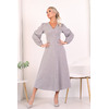 Изящное платье полуприлегающего силуэта из трикотажного полотна серого цвета. V-образный вырез изделия обработан внутренней обтачкой. Втачные рукава дополнены сборкой по линии плеча и обработаны манжетами. В комплект входит декоративный элемент в форме булавки. Длина изделия по спинке от плечевого шва до низа изделия — 122 см. Рост фотомодели — 170 см.
