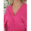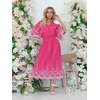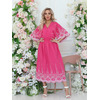 Восхитительное платье полуприлегающего силуэта из текстильной ткани розового цвета с контрастной вышивкой. V-образный вырез обработан окантовкой. Платье с цельнокроеными рукавами. Линия талии завышена, эффектно подчеркнута декоративным швом с резинкой. Длина изделия по спинке от плечевого шва до низа изделия - см. Рост фотомодели - 170 см.