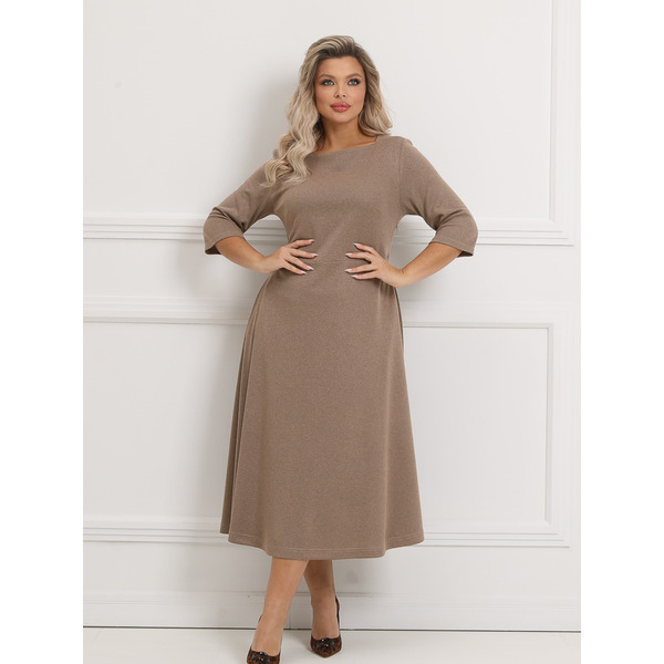 Женственное платье полуприлегающего силуэта из трикотажного полотна бежевого цвета. Фигурный вырез обработан внутренней обтачкой. Платье отрезное по линии талии. По бокам изделия - внутренние карманы. Длина изделия по спинке от плечевого шва до низа изделия - 123 см. Рост фотомодели - 170 см
