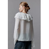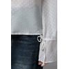 - Глубокий V-образный вырез с завязками и пышными воланами на груди. Застежка на маленькие пуговицы по всей длине. Длинные рукава с воланами и завязками на манжетах. Вышитый принт-горошек по всей длине