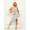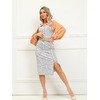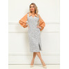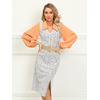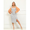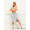 Стильное платье прилегающего силуэта из трикотажного полотна с жаккардовым переплетением серо-бежевого цвета. Фигурный вырез изделия дополнен отложным воротником. Верхняя часть переда дополнена планкой, украшенной пуговицами. Широкие втачные рукава обработаны окантовкой. Перед изделия дополнен разрезом. Ремень в комплект не входит, артикул ремня Р-79/4. Длина изделия по спинке от плечевого шва до низа изделия - см. Рост фотомодели - 170 см.