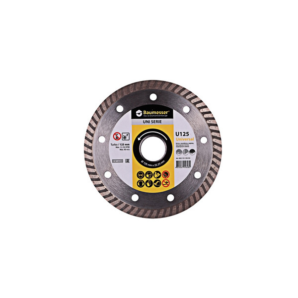 Baumesser Universal с турбированной алмазной кромкой предназначен для качественного реза широкого спектра материалов. Обладает высокой скоростью при работе с бетоном, гранитом, кирпичом, кирпичом облицовочным, песчаником (всеми видами) и тротуарной плиткой.