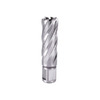 Корончатое сверло имеет посадку WELDON19 и предназначено для использования в магнитных станках. Коронка изготовлена из быстрорежущей стали HSS M2 (улучшенный аналог Р6М5). Выбор материала коронки обусловлен прежде всего типом обрабатываемого материала. Общие правила таковы: для работы по конструкционным сталям и в условиях недостаточной жёсткости системы "станок-инструмент-деталь" (наличие вибраций), выбирают материал коронки HSS, при обработке легированных сталей и нержавеющей стали выбирают коронку с ТВ пластинами. Обладает высоким ресурсом резания! Также имеется возможность осуществлять перезаточку до 5 раз, при этом ресурс будет снижаться, по сравнению с заводской заточкой. Необходимо использовать штифт размером 6,34/102 мм, артикул 71506001 № 501. Использование СОЖ обязательно, только в этом случае инструмент обеспечивает максимальный ресурс.