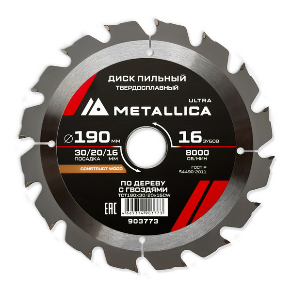 Диск пильный тв. сплав. Metallica Ultra 190*30/20/16мм 16зуб Т=2,4мм по строй древесине/гвозди 903773