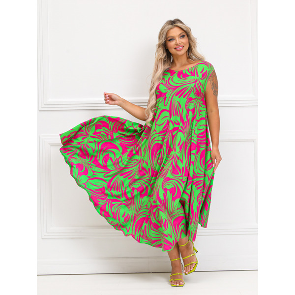Яркий сарфан полуприлегающего силуэта из текстильной ткани зеленого цвета . Круглый вырез изделия обработан внутренней бейкой. Проймы рукавов обработаны внутренней окантовкой. Длина изделия по спинке от плечевого шва до низа изделия - 132 см. Рост фотомодели - 170 см.