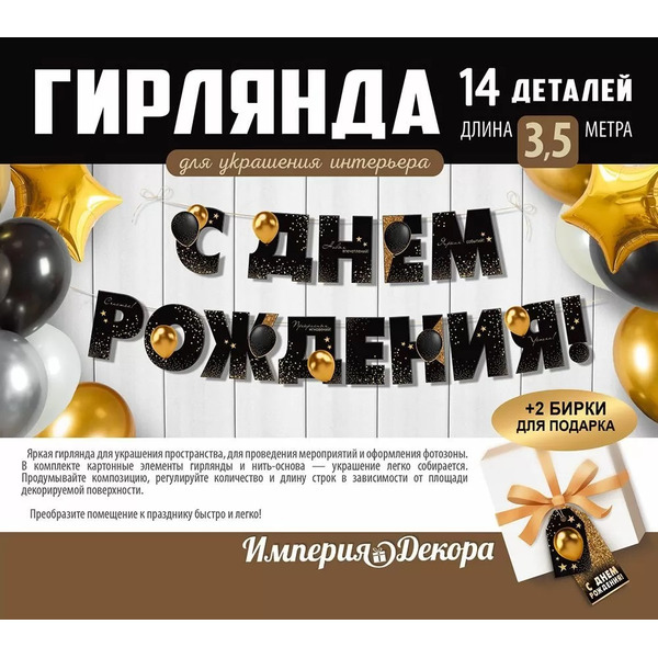 Гирлянда С Днем Рождения! (золотые шары), Черный, 350 см, 1 шт.