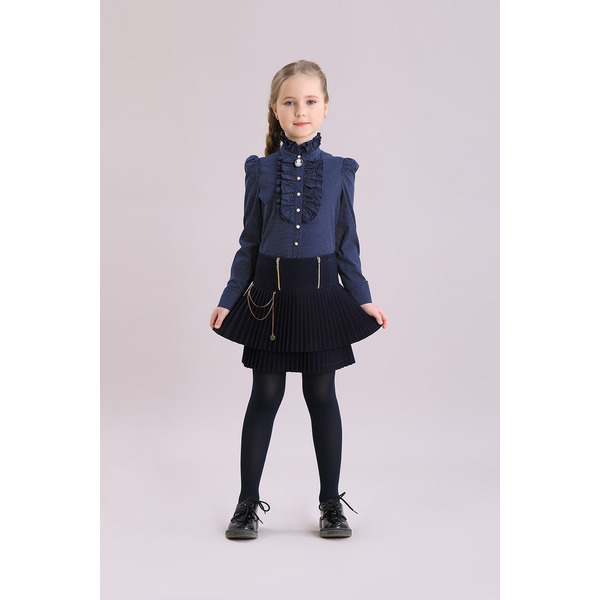 Школьная блузка с длинными рукавами для девочки. Модель выполнена из блузочной ткани в горошек. Планка с застежкой на пуговицы и воротник-стойка декорированы волнистыми рюшами и брошью камея.
