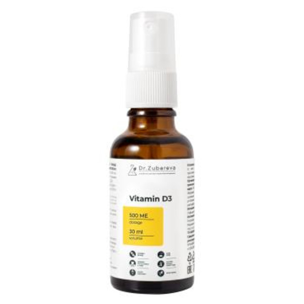 Витамин D3 — один из наиболее важных витаминов для здоровья человека. Он играет ключевую роль в усвоении кальция и фосфора в организме, способствуя укреплению костей и зубов. Кроме того, витамин D3 поддерживает иммунную систему, снижает риск развития простудных заболеваний, улучшает настроение и помогает справляться с признаками депрессии.Витамин D3 выполняет и ряд других не менее важных функций:Повышает мышечный тонус;Снижает риск развития остеопороза;Регулирует работу щитовидной железы;Поддерживает репродуктивное здоровье женщин и мужчин;Повышает прочность костной ткани;Повышает уровень серотонина.Витамин D3 от Dr.Zubareva — это:Удобная форма приема (впрыск);Оптимальная дозировка активных веществ, обеспечивающая быструю усвояемость даже у детей с трех лет;Удобная форма спрея обеспечивает биодоступность и быстрое восполнение недостатка витамина Д3 в организме;Состав, разработанный практикующим врачом превентивной медицины Натальей Зубаревой.Нутрицевтик соответствует мировым стандартам качества: производится из качественного сырья, не содержит консервантов и проходит контроль качества с лабораторным подтверждением на каждом этапе производства.Признаки дефицита витамина D3 в организме:Боли в мышцах и костях, слабость;Судороги губ, языка, пальцев, спазм кистей, стоп и лицевых мышц;Переломы костей даже при минимальных травмах.Осложнения дефицита витамина D3 у детей.Недостаток витамина D у детей может вызвать рахит — заболевание, при котором нарушаются процессы формирования костной ткани и кости становятся мягкими, возможны деформации скелета.