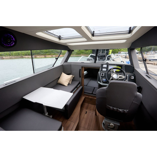 Отличная обзорность и освещенность каюты достигаются за счет панорамного остекления и больших сдвижных люков в крыше.