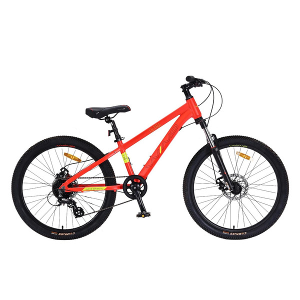 Велосипед, предназначенный для детей в возрасте от восьми до тринадцати лет, с оборудованием начального любительского класса Shimano, 8 скоростей. Технические особенности: легкая алюминиевая рама (сплав 6061, частично скрытая проводка, кареточный стакан BSA, крепление калипера IS, съемный петух, бонки для багажника и флягодержателя), амортизационная вилка (пружинная, ход 50 мм, крепление калипера Post Mount, блокировка, регулировка преднагрузки), двойные алюминиевые обода (под AV ниппель), дисковые механические тормоза (роторы 160/160 мм), защита цепи, подножка, катафоты. Подходит для прогулочного катания в городских условиях и по несложным маршрутам в лесу. Диаметр колес - 24 дюйма. Вес - 12 кг.