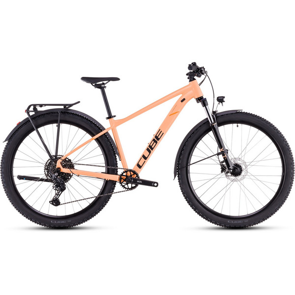 Горный велосипед с оборудованием предпрофессионального класса Shimano, 10 скоростей. Технические особенности: легкая алюминиевая рама Aluminium Lite (двойной баттинг, гидроформинг, скрытая проводка, конический рулевой стакан, крепление для подножки), амортизированная вилка SR Suntour XCT Disc (пружинно-эластомерная, ход 100 мм, механическая блокировка), двойные алюминиевые обода CUBE ZX20, дисковые гидравлические тормоза Shimano BR-MT200/UR300 (роторы 160/160 мм), длинные крылья, система освещения, подножка, звонок, задний багажник. Подходит для активного катания по различным дорогам и пересеченной местности. Диаметр колес - 27,5 дюймов. Вес - 17 кг.
