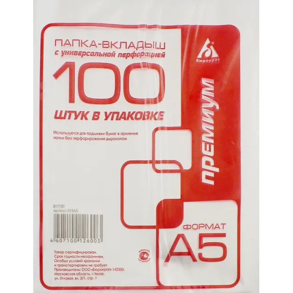 Папка-вкладыш. Для подшивки бумаг в архивные папки без перфорирования дыроколом. Формат: А5. Количество: 100 штук. Глянцевая. Сделано в России.