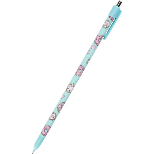 Качественный пластиковый корпус украшен стильным нежным принтом с изображением пончиков в розово-голубых тонах. Карандаш оснащен удобным нажимным механизмом и клип-зажимом. Без ластика.
