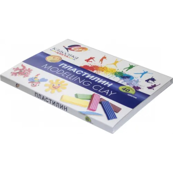В наборе 40 цветов пластилина: Белый, Желтый, Красный, Зеленый светлый, Синий, Черный, Фиолетовый, Оранжевый, Красно-коричневый, Изумрудный, Фиолетово-розовый, Розовый, Коричневый, Серый, Голубой, Бежевый, Зеленый темный, Рубиновый, Лимонный, Оранжево-желтый, Ультрамарин, Травяная зелень, Розовый темный, Фиолетовый светлый, Желтый темный, Телесный, Розовый флуоресцентный, Пудровый, Шоколадный, Салатовый, Васильковый, Какао, Морковный, Голубой флуоресцентный, Бордовый, Мятный, Сиреневый, Сиренево – розовый, светло-серый.