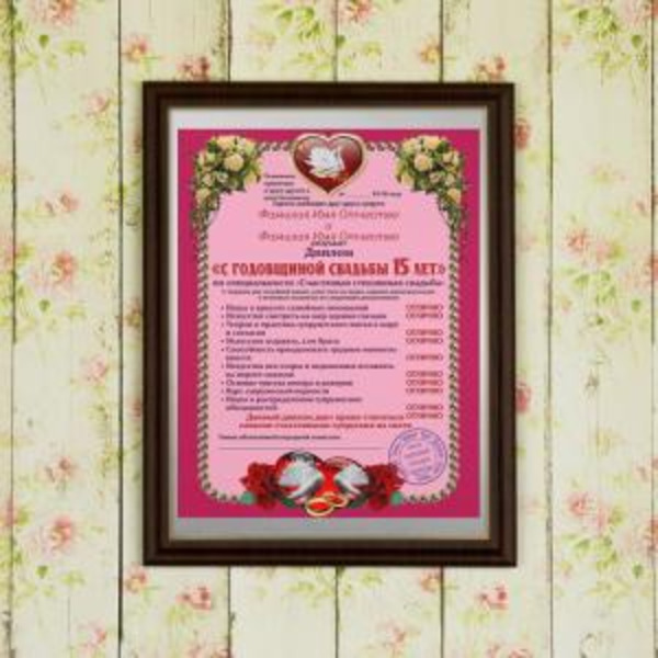 Подарочный диплом (плакетка) *С годовщиной свадьбы 15 лет*
