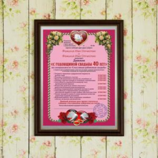 Подарочный диплом (плакетка) *С годовщиной свадьбы 40 лет*