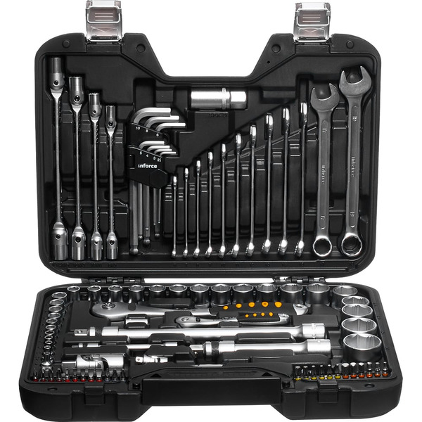 Набор инструментов Inforce 85 предметов 1/2", 1/4" Inforce 06-07-14 - многофункциональный комплект, предназначенный для работ с крепежом. Уникальная запатентованная конструкция трещотки гарантированно выдерживает высокие нагрузки. Улучшенный профиль торцевых головок успешно справляется с крепежом, грани которого деформированы на 85%. Комбинированные ключи выполнены методом цельной ковки и выдерживают высокие нагрузки. Перед использованием рекомендуется произвести 25 циклов вращения трещоточного механизма - для распределения смазки по всей поверхности механизма.