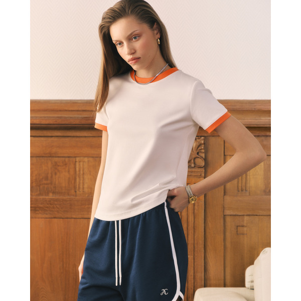 Футболка приталенного кроя в ретро-стиле из эластичного материала с контрастными деталями. Выполнена из хлопка с добавлением спандекса. Сзади вышивка AC (монограмма Abrau Club).